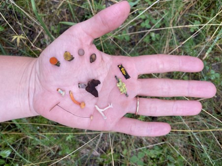 Det var ikke mange virvelløse dyr ute på en regnfull dag i august, men vi fant 15 ulike arter. Av disse var det noen humler, sommerfugler, teger, fluer, en edderkopp og en snegle.